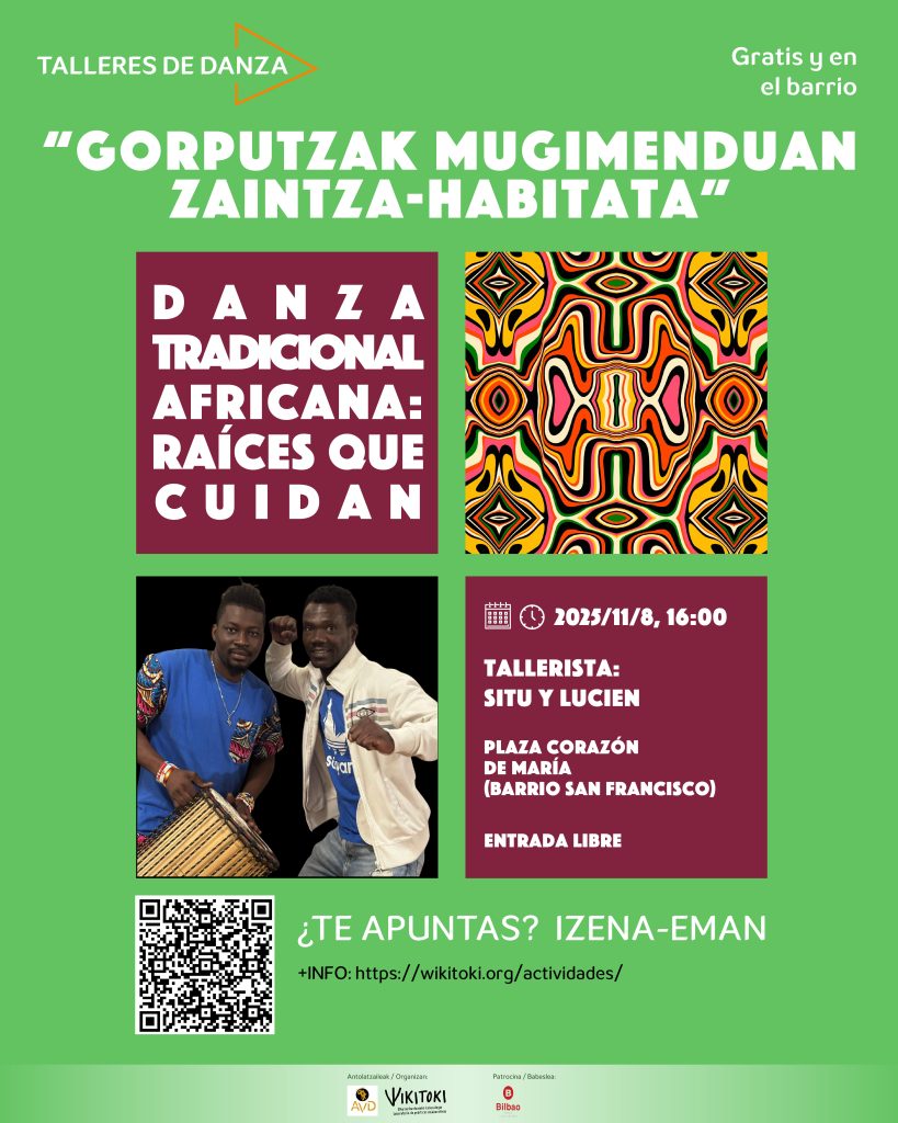 Wikitoki y la asociación African Vibes Dance, dentro de su residencia «Cuerpos en tránsito / hábitat de cuidado«, invita a participar en talleres de danza gratuitos para explorar cómo el movimiento genera redes de cuidado y pertenencia. A través de estos talleres abiertos dirigidos a vecinas y vecinos de Bilbao, se crearán partituras de movimiento y micro rutinas colectivas.